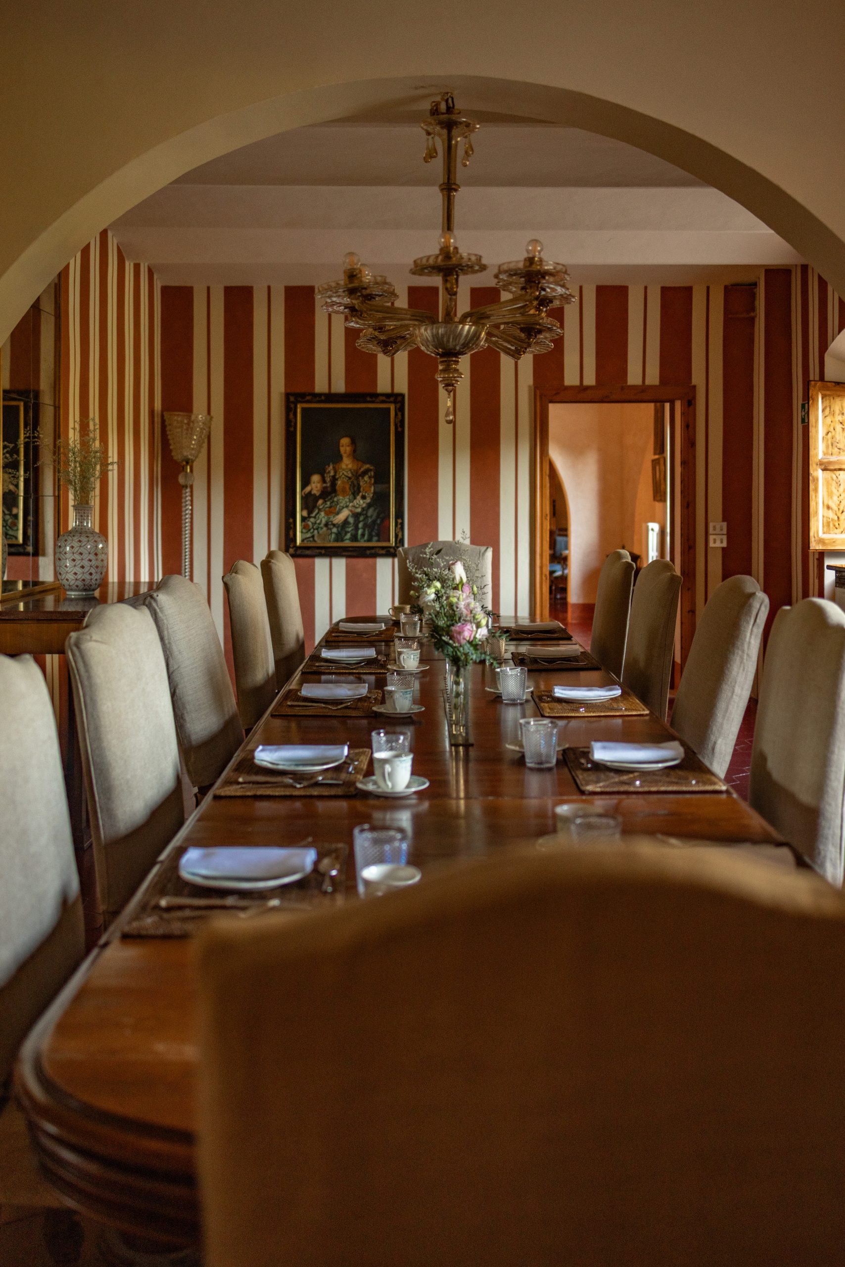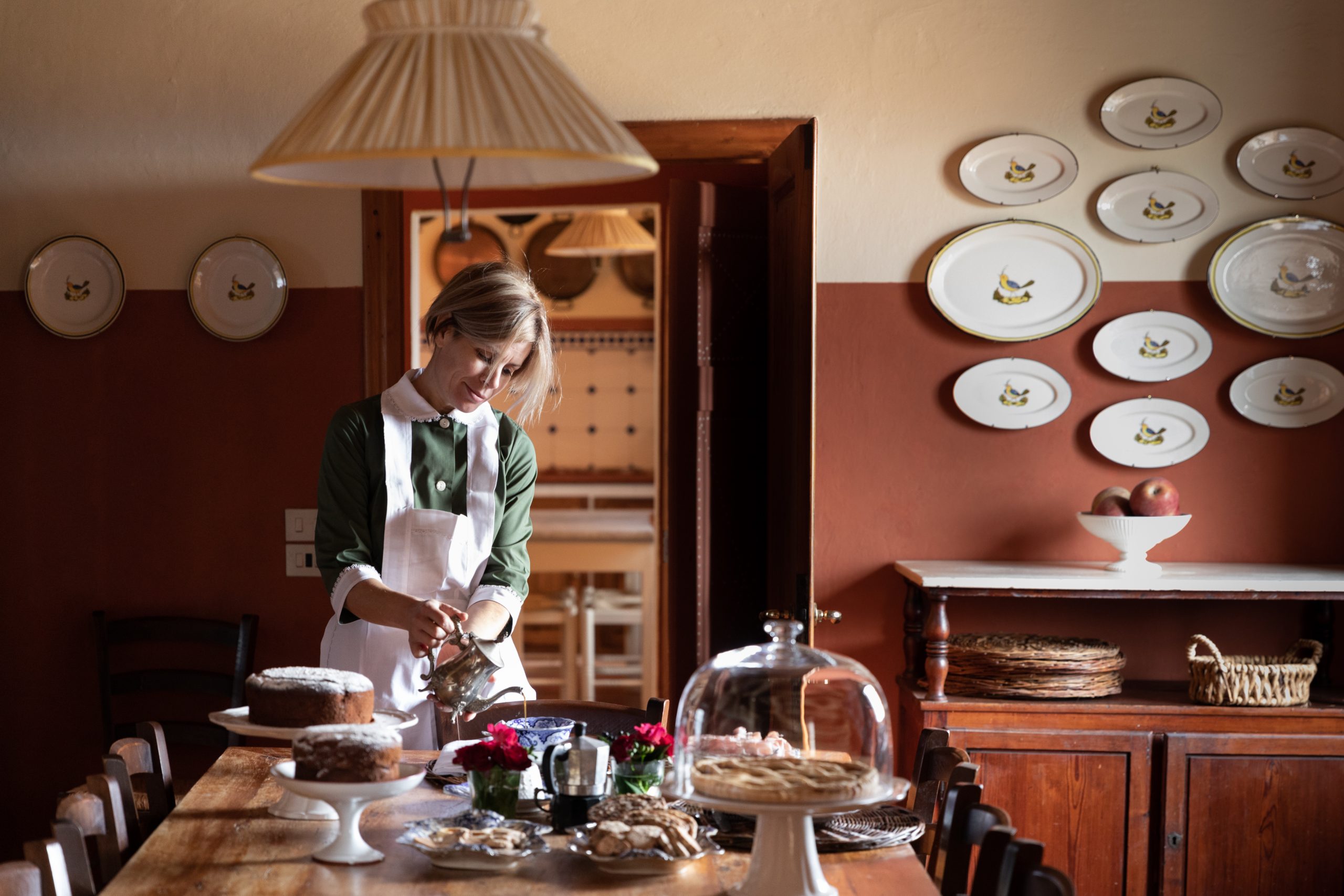 La sala da pranzo con l’ampio tavolo e le grandi sedie per un dinner più formale e la sala di caccia dallo stile country per un dinner a buffet o per un easy lunch. Le pietanze rigorosamente in stile toscano e realizzate con ingredienti freschi e di stagione.
