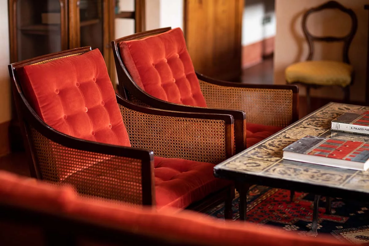 Il rosso del cotto e l’azzurro del cielo questi i colori dei salotti di villa Piaggia all’insegna della tradizione e del relax. Ampi spazi dove conversare, leggere e riposare.