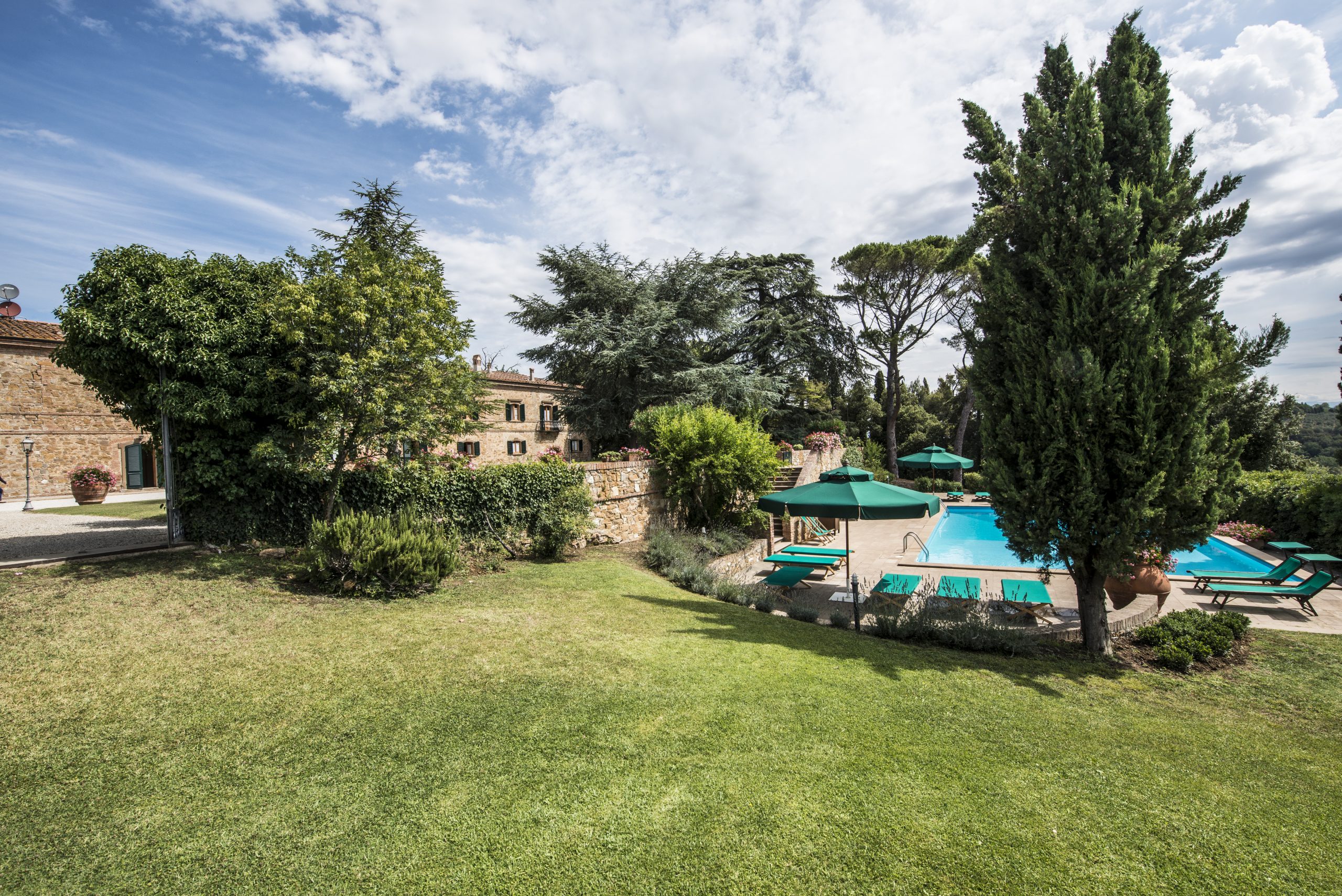 Nel cuore della fattoria si trova la villa dall’insolita forma allungata realizzata in pietra a faccia vista che può ospitare comodamente 25 persone ed è dotata di ogni comfort. Di fronte alla villa un ampio giardino dal quale si gode un panorama mozzafiato sulla campagna toscana. Una scala in pietra a doppia rampa conduce alla piscina, circondata da un grande prato dal quale si accede al caratteristico loggiato, dove è possibile mangiare e rilassarsi nella zona salotto. Sul retro del loggiato, un bagno, una grande doccia, due ampi spogliatoi e l’area attrezzata per la cucina con frigorifero.